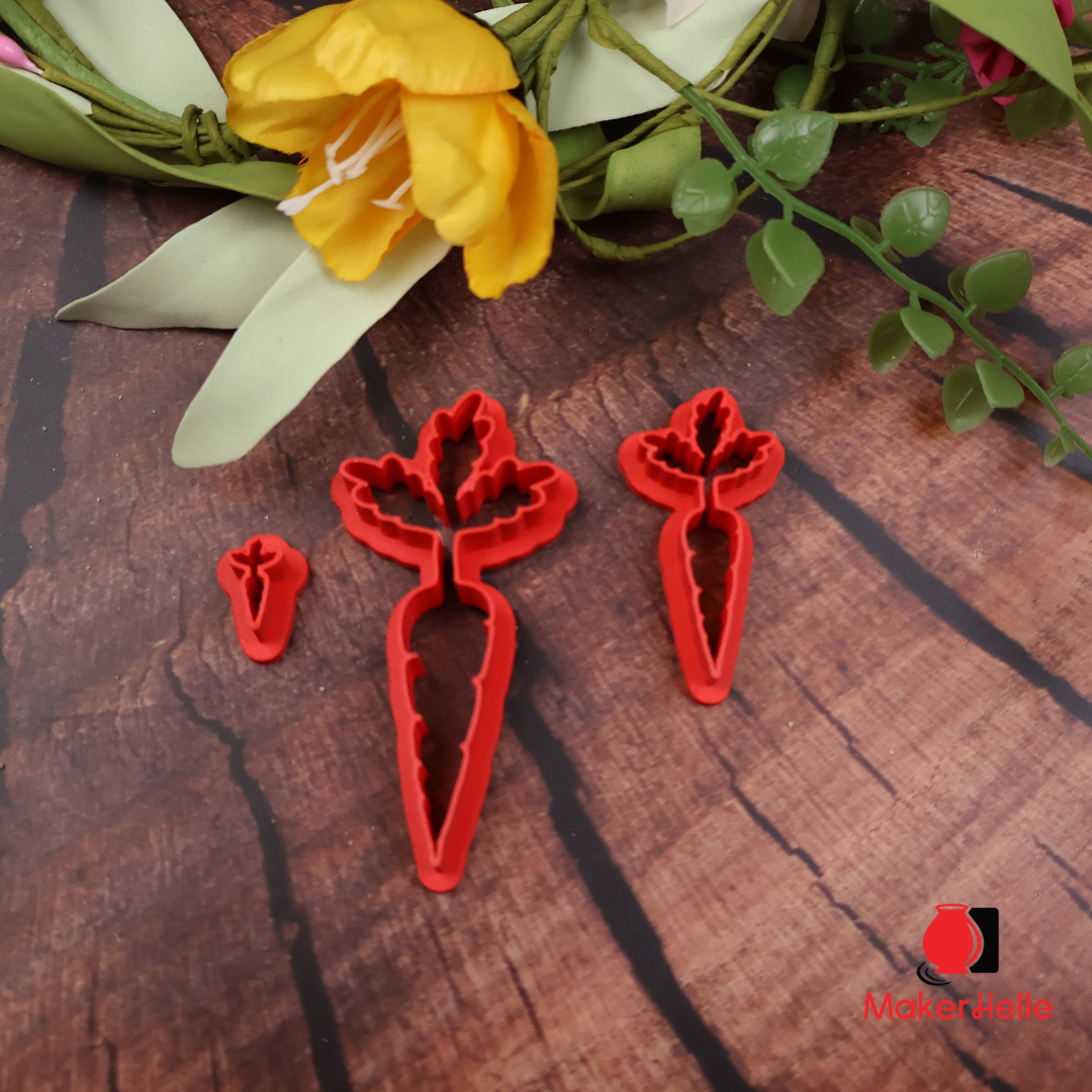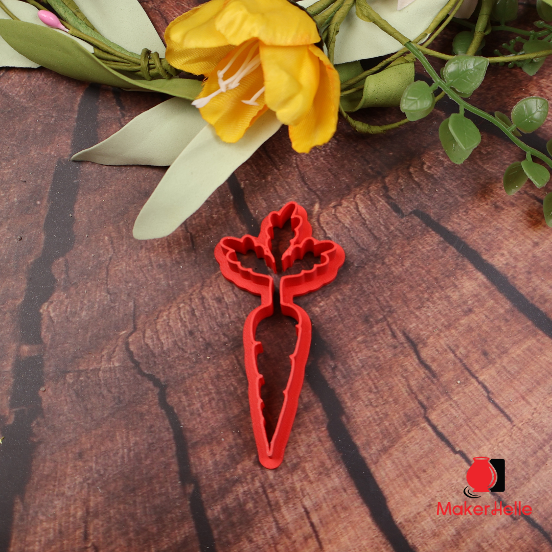 Udstikker – Gulerod En fin og dekorativ udstikker formet som en gulerod med top – et klassisk symbol på forår, haveglæde og hyggelige, fortællende motiver. Udstikkeren giver dig hele guleroden inklusiv grøn top i én form, så du nemt kan skabe genkendelige og harmoniske figurer direkte i leret. Perfekt til at kombinere med påskeharen, som kan holde, spise eller hoppe rundt