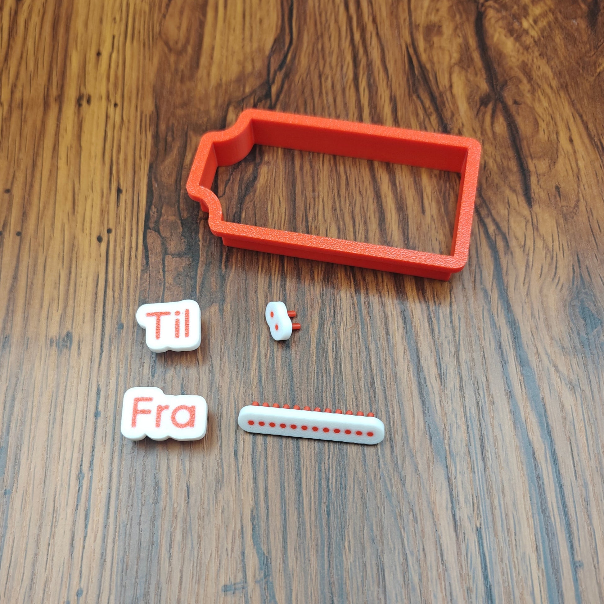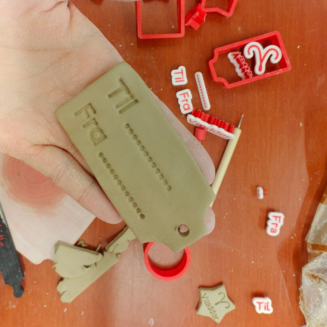 Til / Fra kort – stempelsæt Et lille, smart sæt til at lave dine egne til/fra kort i ler – som kan bruges igen og